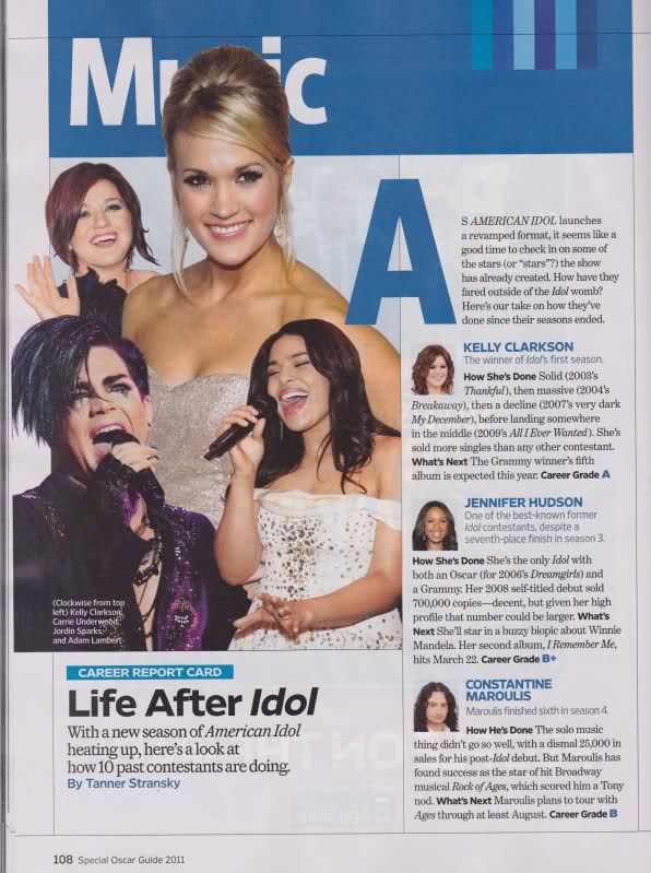 While reading Entertainment Weeklys Oscar Edition (Feb. 4, 2011), I came across Life After Idol by Tanner Stransky. Of course my pulse quickened, hoping theyre heaping praise on Adam Lambert. Yes, hes pictured in the main photo so I know its going to be good!